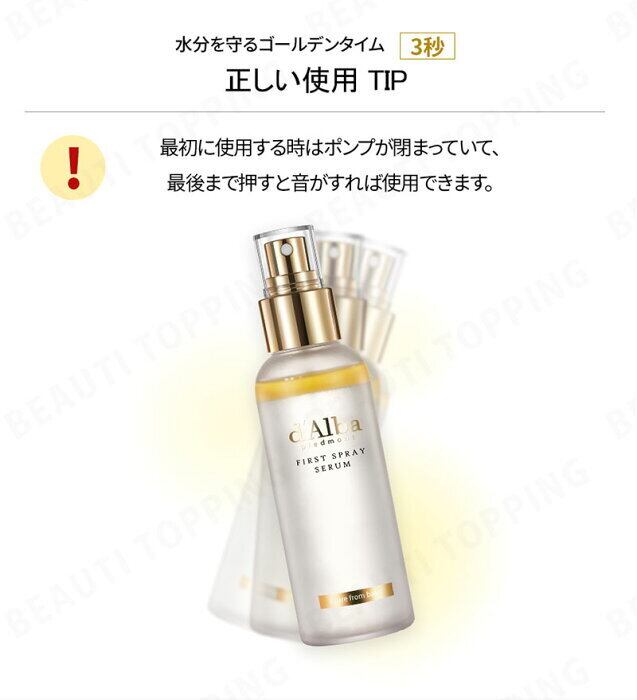 使用方法: 洗顔直後、製品を上下に3~5回振り、内容物をしっかり混ぜます。顔を少し上げた状態で、30cmほど離し、目を閉じて、顔全体に4~5回ムラなくスプレーした後、軽くたたいて肌に浸透させます。