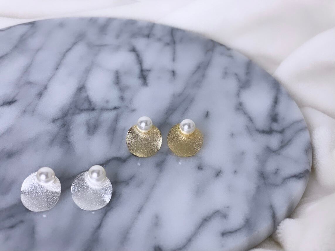 円形のデザインプレートと一粒パールのピアス。