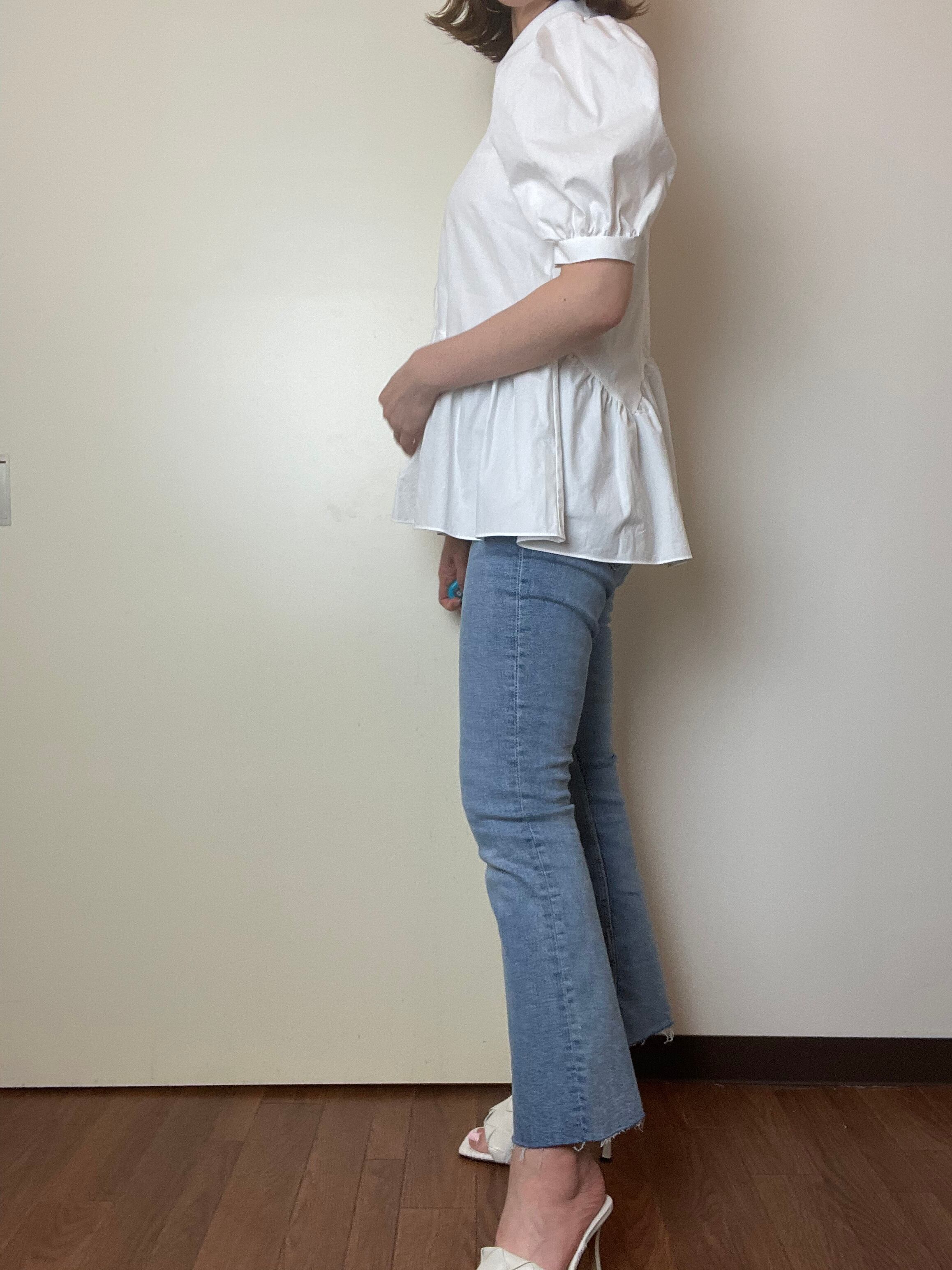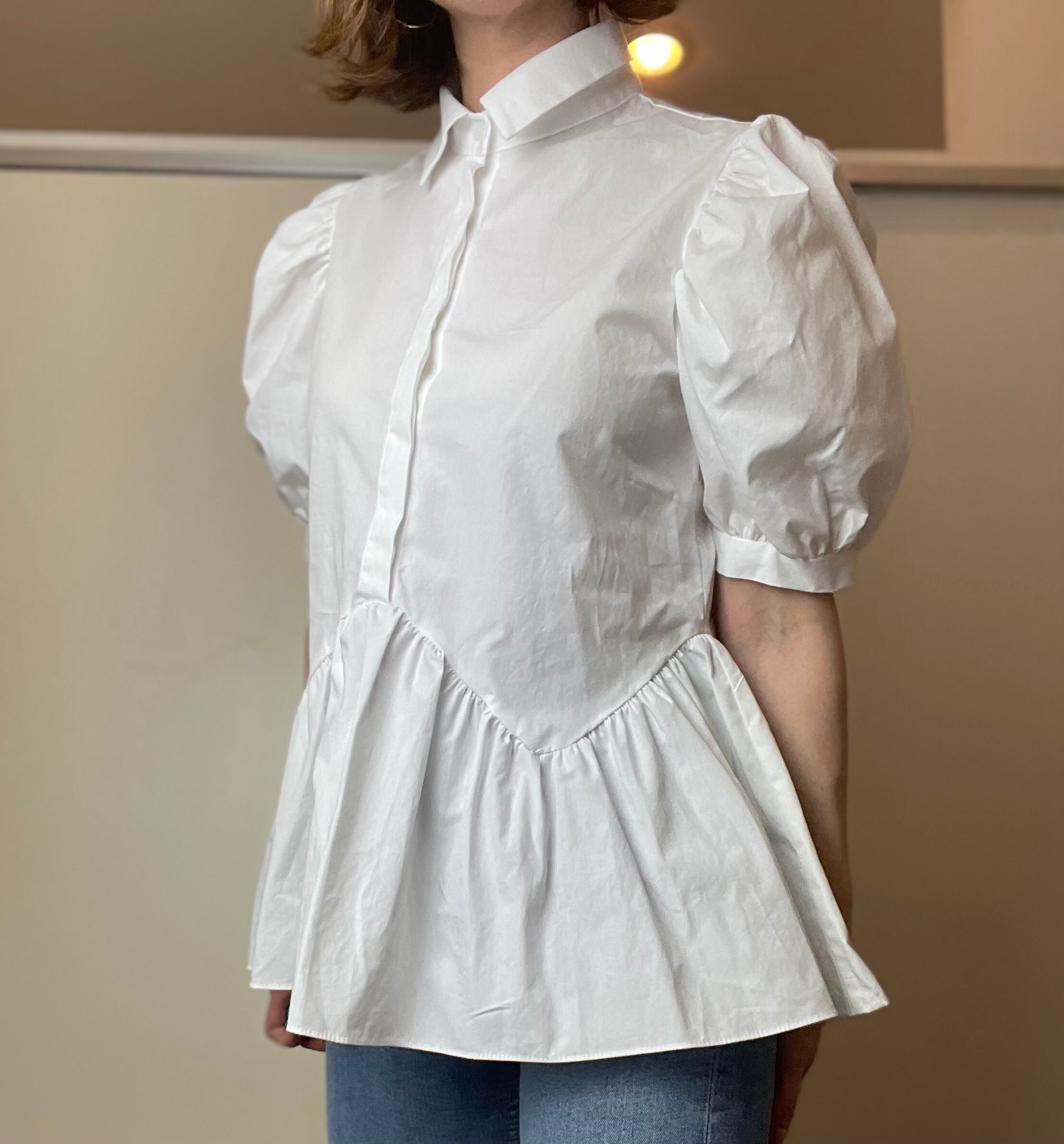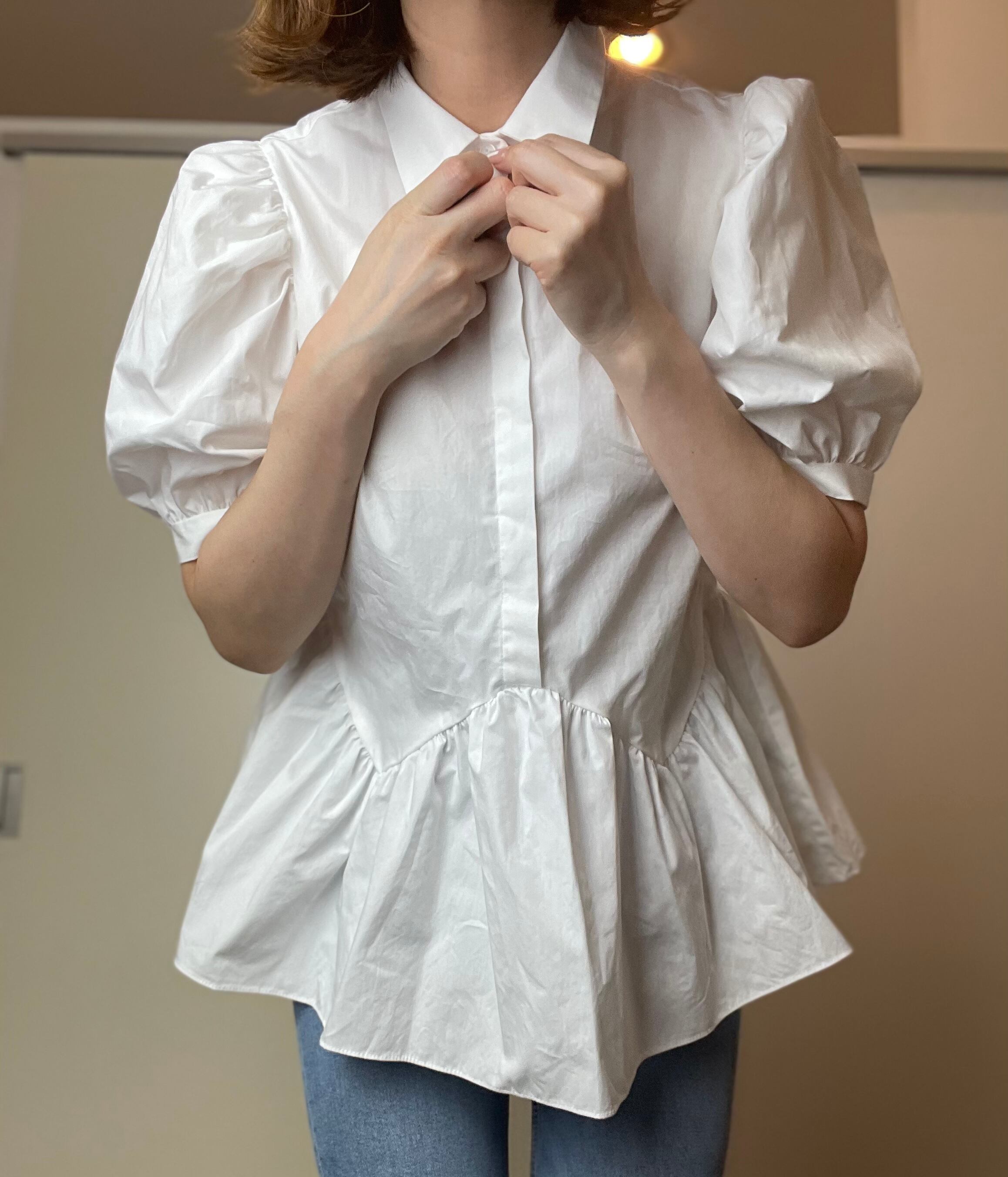 トレンドのパフスリーブと胸下からの切り替えフレアになったデザインシャツ。
