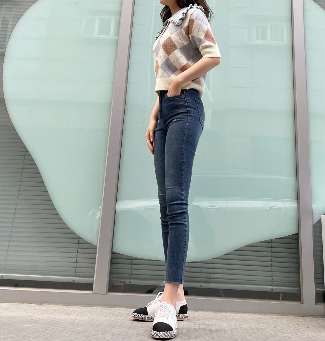 首元の襟のフリルがポイントで、単体で見ると、女の子しすぎって思ってしまうかもしれないけれど、スキニーやスラックス、ジャケットなどと合わせることで、負担なく、着用可能です‼︎