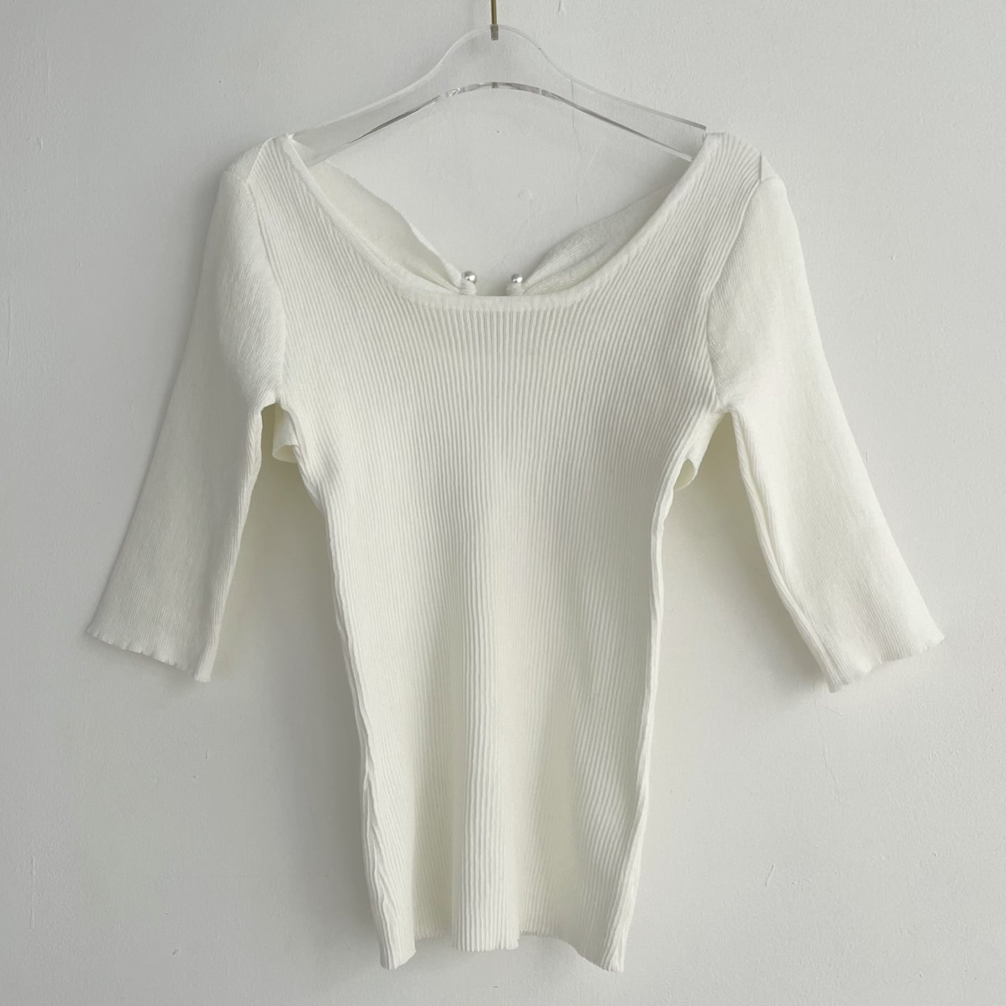 前はシンプルなラウンドネックのデザインで、後ろ部分には、真珠とシャーリングでオシャレに引き締まって見えます♪